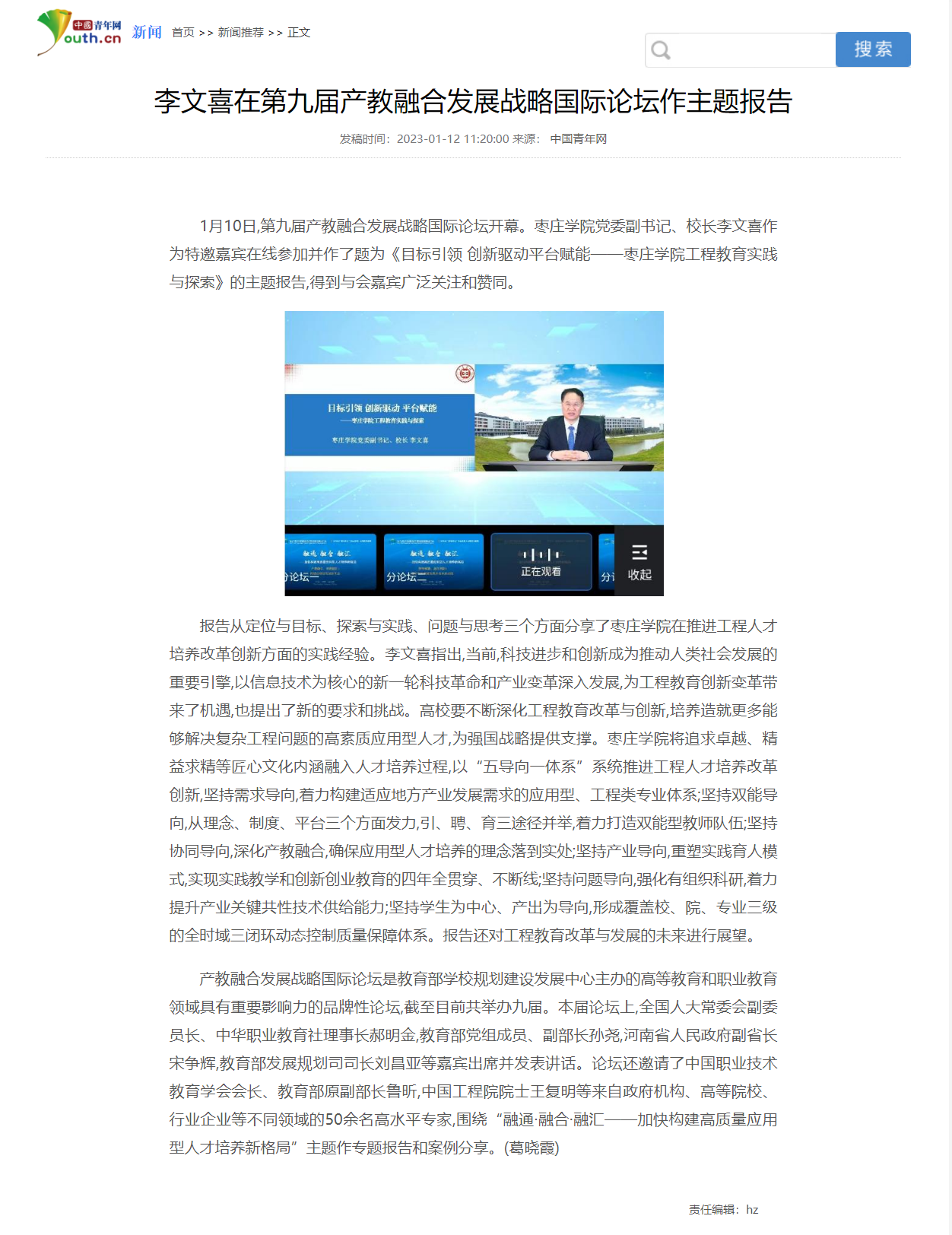 1月10日,第九届产教融合发展战略国际论坛开幕。枣庄学院党委副书记、校长李文喜作为特邀嘉宾在线参加并作了题为《目标引领 创新驱动平台赋能——枣庄学院工程教育实践与探索》的主题报告,得到与会嘉宾广泛关注和赞同。